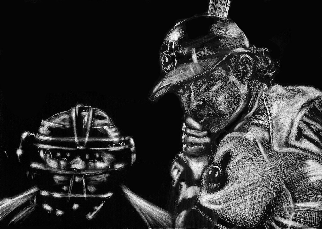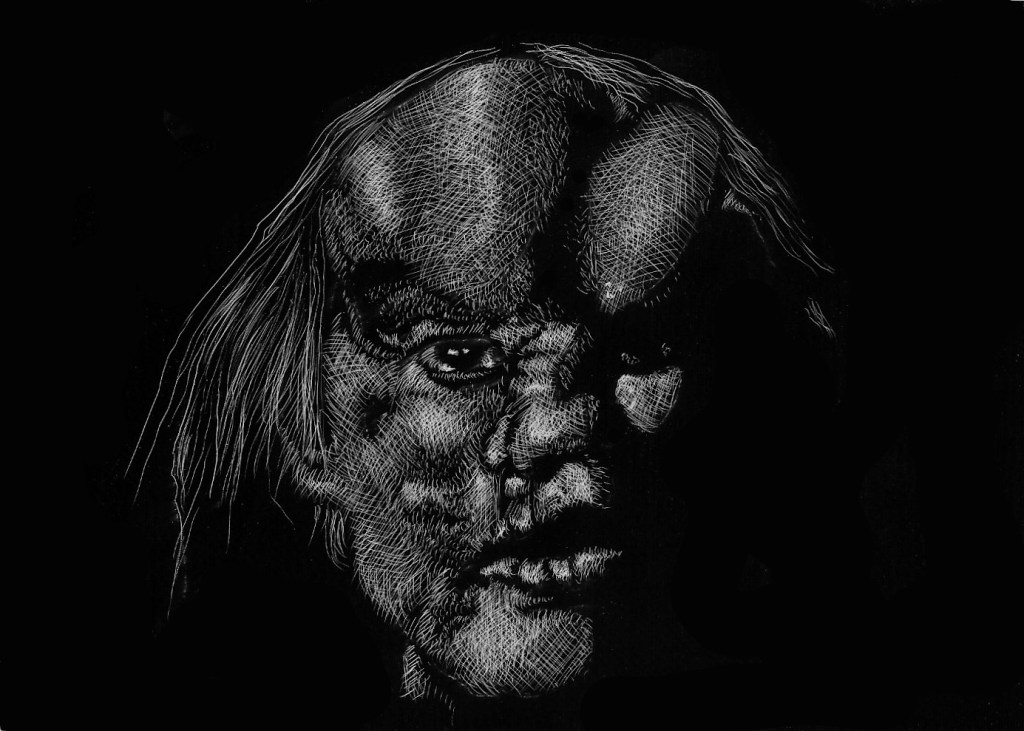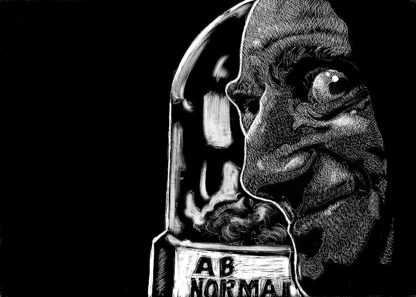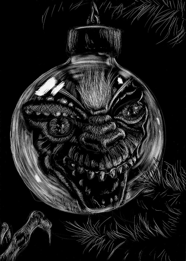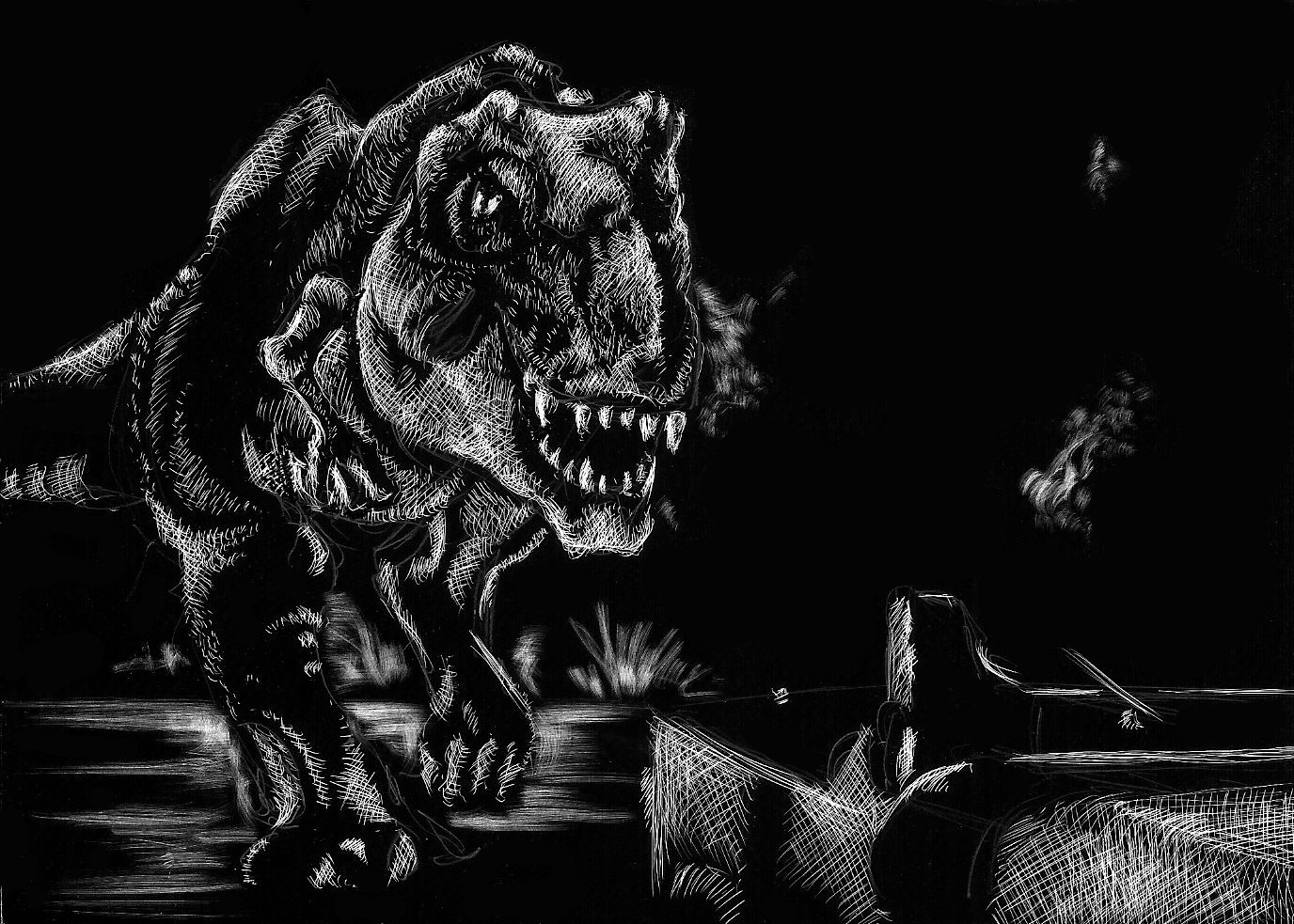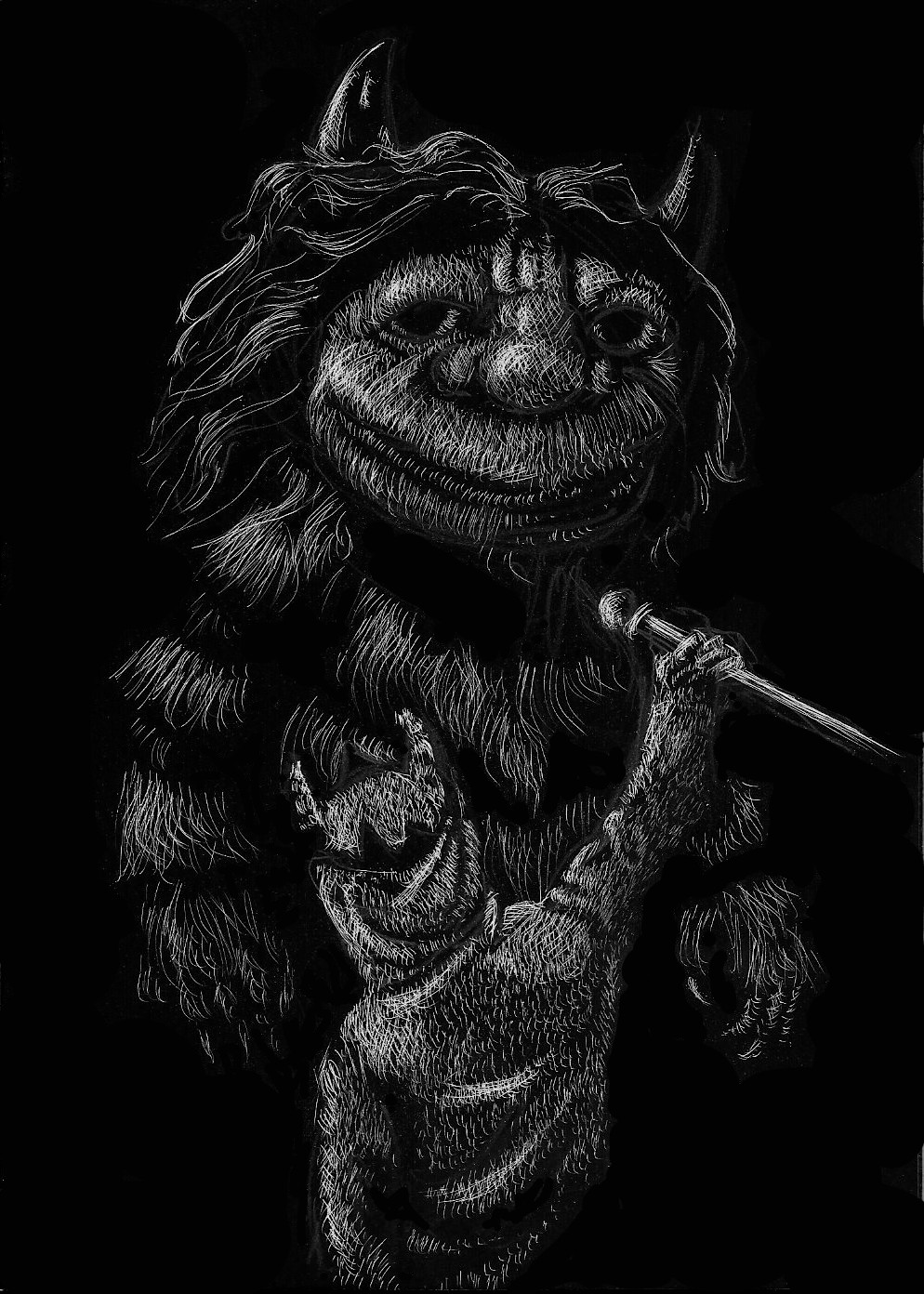 My personal concept for the challenge was to create a 5″x7″ scratchboard everyday (not the smartest of ideas as scratchboard is very labor intensive). Thematically I was taking Jake’s daily prompts and trying to relate them to a television show or movie. Some a direct illustration of the prompt some a little tongue and cheek, ie. Tasty.