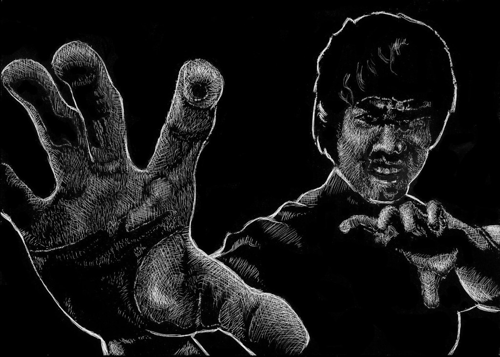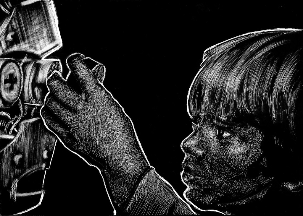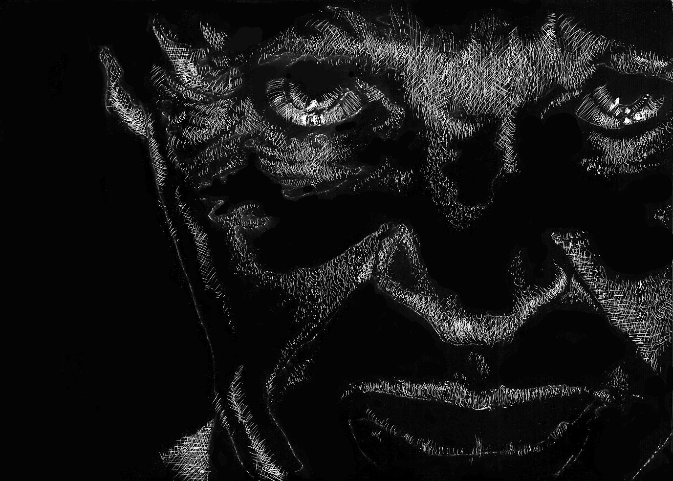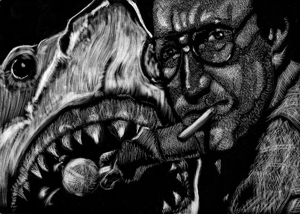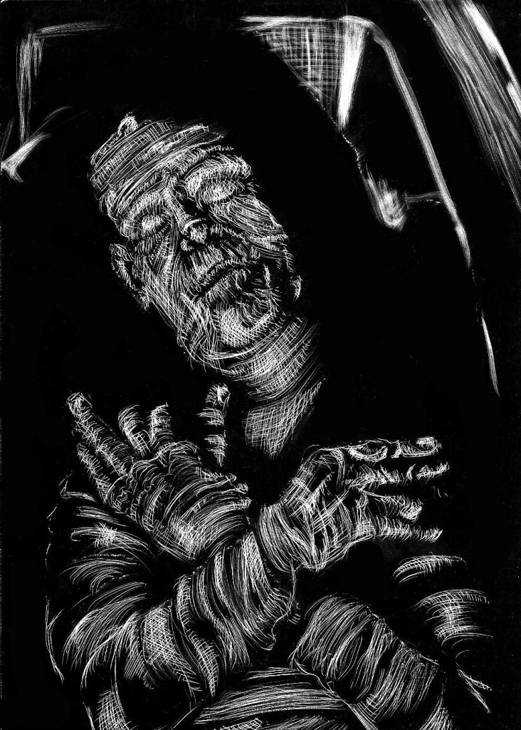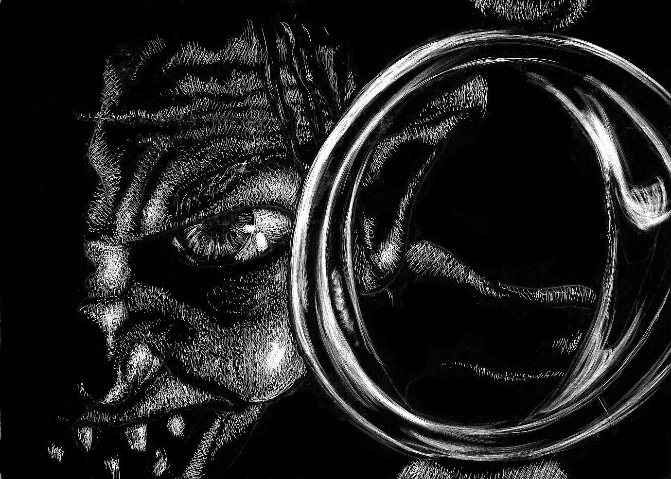 My personal concept for the challenge was to create a 5″x7″ scratchboard everyday (not the smartest of ideas as scratchboard is very labor intensive). Thematically I was taking Jake’s daily prompts and trying to relate them to a television show or movie. Some a direct illustration of the prompt some a little tongue and cheek, ie. Tasty.