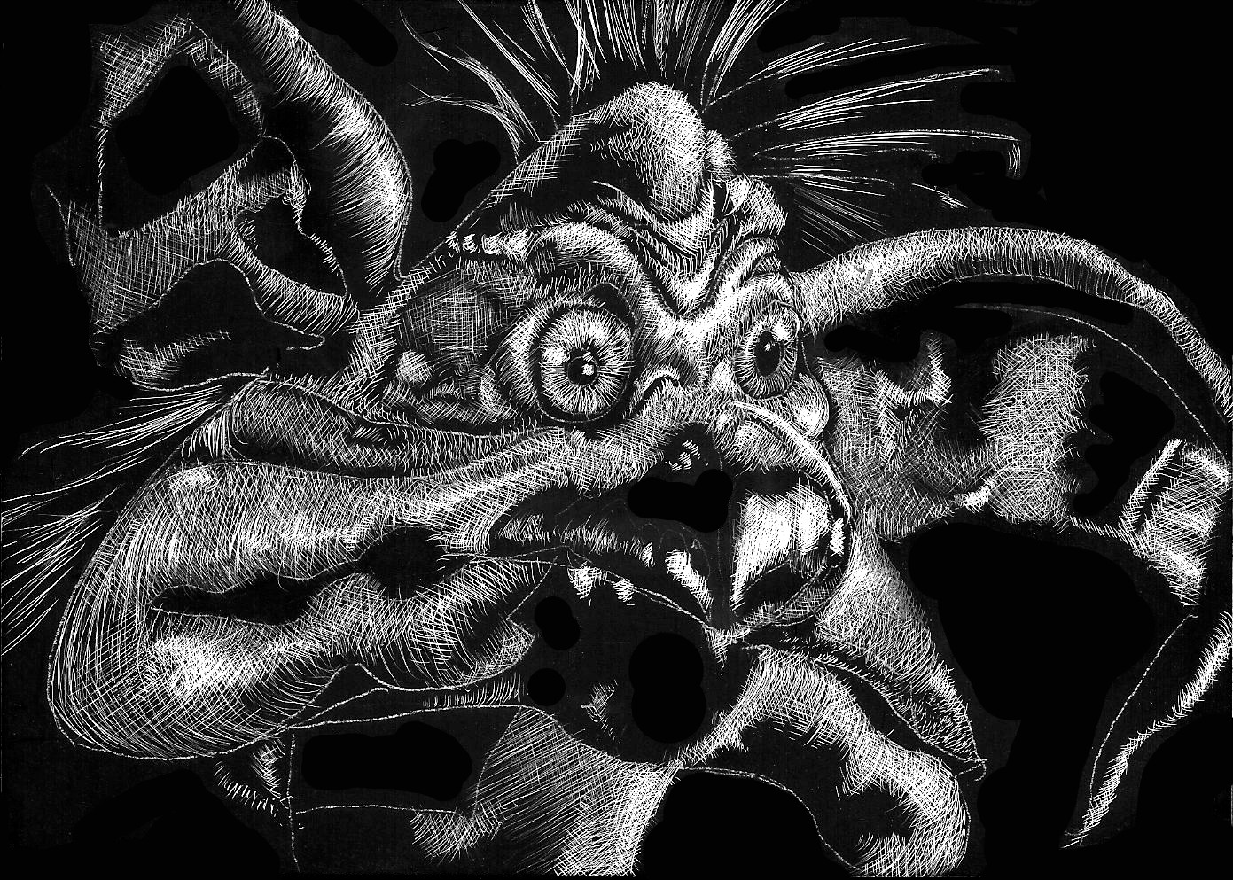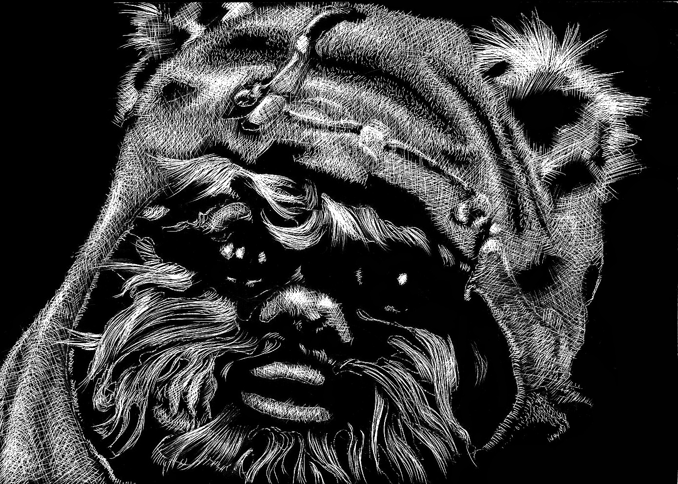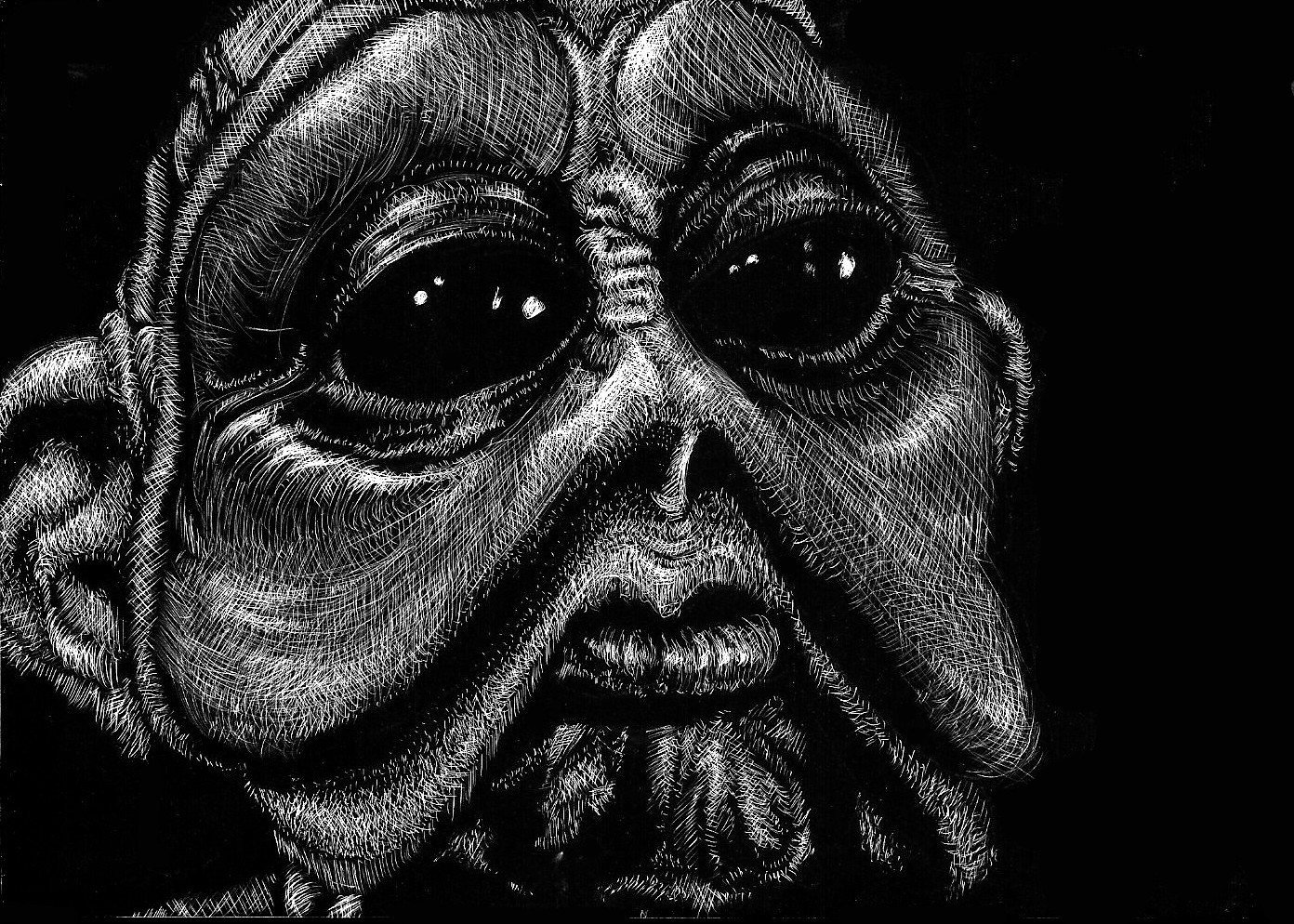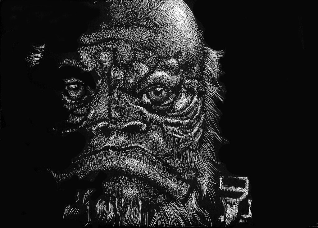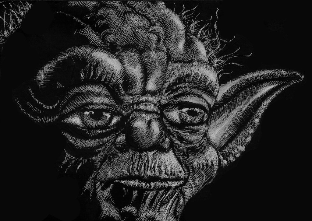The creatures of Star Wars are so perfect for scratchboard, they are easy to overlook. I did. It was a student of mine Adam, who turned in a project of Chewbacca that impressed me so much I had to see his Wookie and raise him a Jedi Master. I scratched the board of Yoda and found the characters a natural. Even with the replacement by CGI, I like to think of these characters as the Muppets of Star Wars. The combinations of textures and the dramatic lighting of the films make each a unique challenge in rendering the character. Between projects as I need to practice I just pick another creature, with a whole Galaxy to choose from the possibilities are endless.