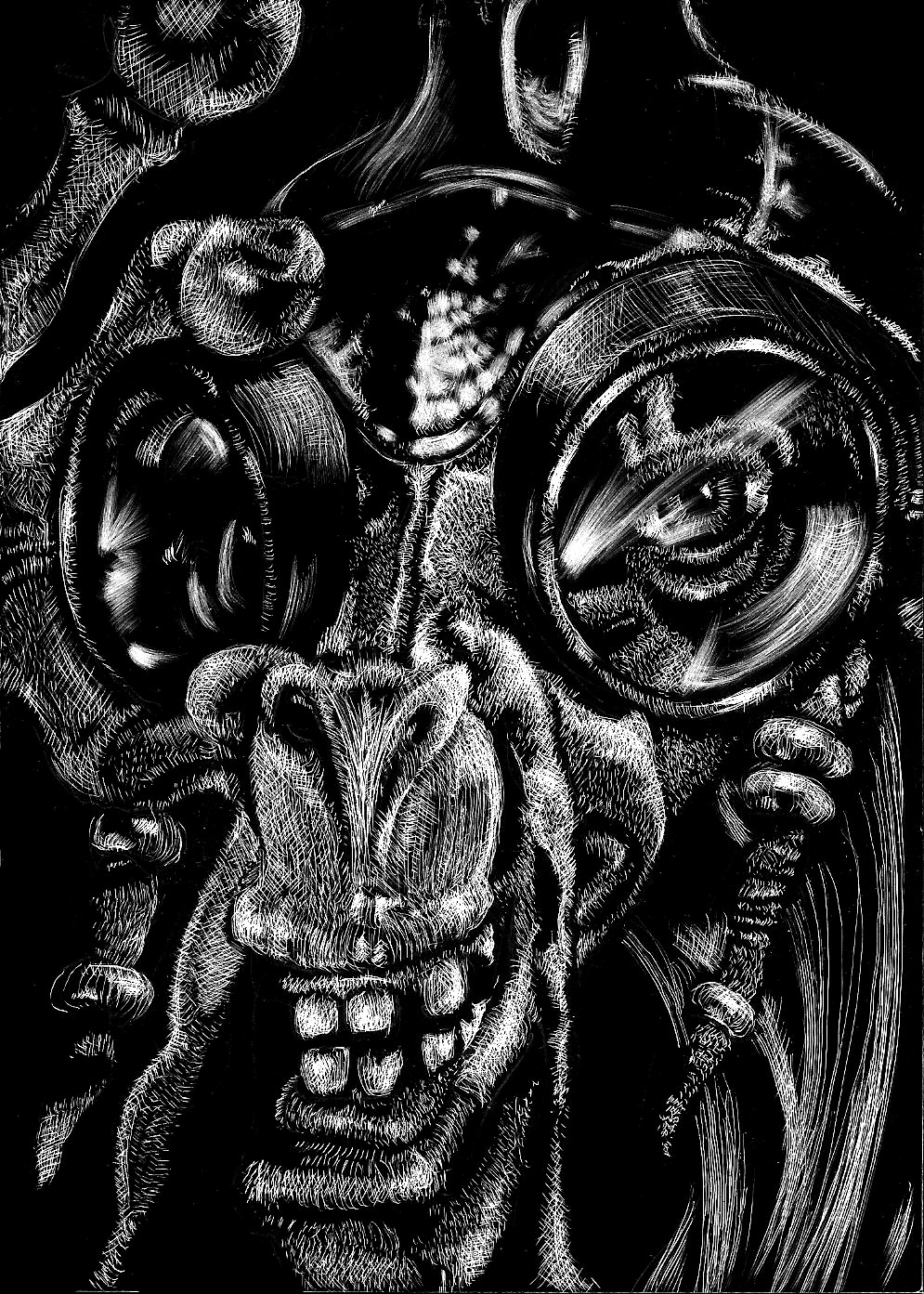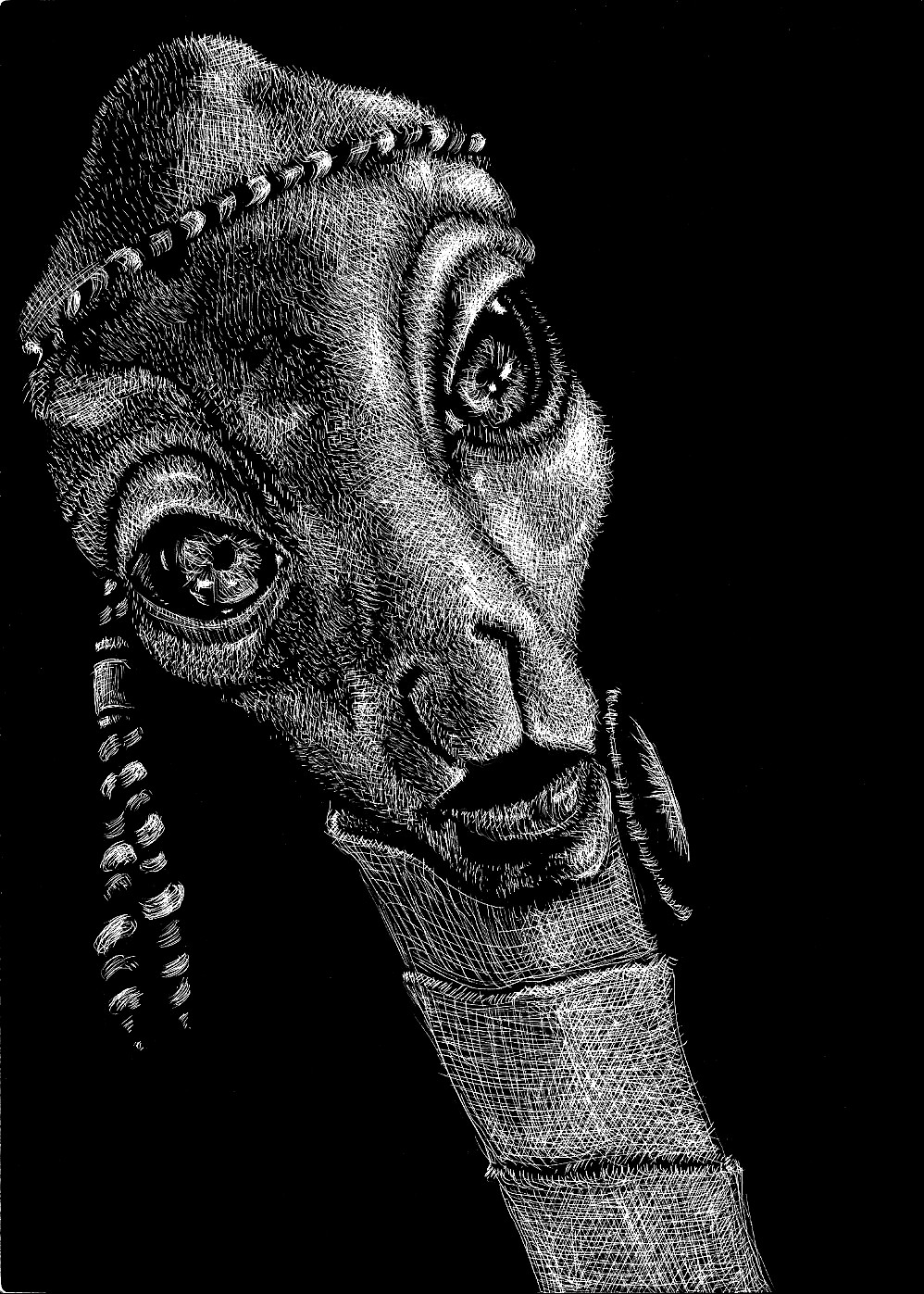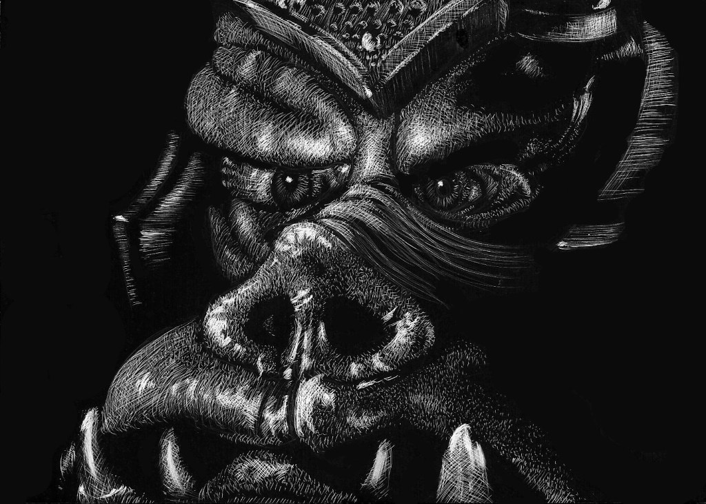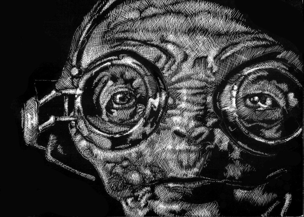 The creatures of Star Wars are so perfect for scratchboard, they are easy to overlook. I did. It was a student of mine Adam, who turned in a project of Chewbacca that impressed me so much I had to see his Wookie and raise him a Jedi Master. I scratched the board of Yoda and found the characters a natural. Even with the replacement by CGI, I like to think of these characters as the Muppets of Star Wars. The combinations of textures and the dramatic lighting of the films make each a unique challenge in rendering the character. Between projects as I need to practice I just pick another creature, with a whole Galaxy to choose from the possibilities are endless.